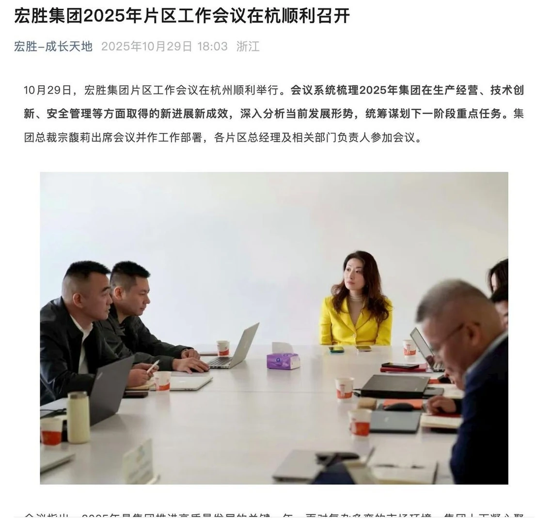 辞职后的宗馥莉,其实并未“隐身”,只是换了个舞台。10月29日,宏胜集团片区工作会议在杭州举行,宗馥莉以集团总裁身份高调出席并部署工作,要求团队“推进工艺创新、加快产线智能化升级、深化人效管理改革”。这场会议距离她辞去娃哈哈职务仅一个半月,足以证明她的精力已全面转向宏胜及“娃小宗”品牌。