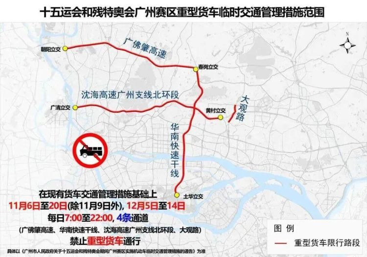 残特奥会期间(12月5日至12月14日)每日7时至22时,在现有市区货车限行措施基础上,增加禁止重型货车通行广佛肇高速、华南快速干线、沈海高速广州支线北环段、大观路的临时管理措施。