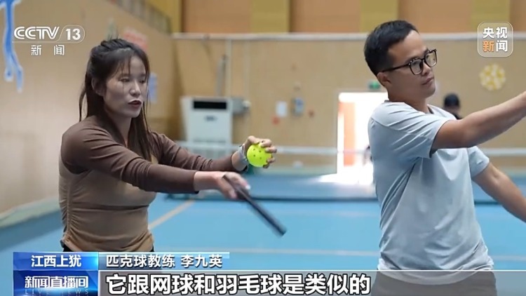 总台记者 谢元森:匹克球,我们可以把它看作一个镂空的塑料网球。它怎么玩?它就是在一个羽毛球场地上,用大号的乒乓球拍来打网球,它的规则要比以上的三种运动都要简单,普通人只要学习10多分钟就能轻松上手。